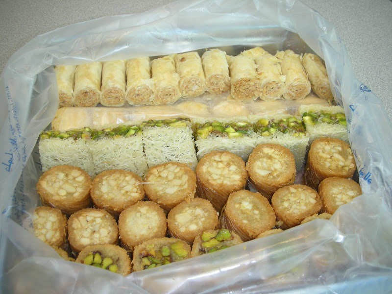 When you open the box there is a nicely displayed selection. Several were rolled dough with a nut filling. Others were sandwich like with the bread part of the "sandwich" being kataifi. Aren't you impressed that we know that name? It's because we saw it on a menu the day before and had to look it up. How random that the next day it showed up in this box of sweets so that we can identify it and thereby show how knowledgeable we are! As you can see from the pictures the Lebanese don't skimp on their nuts! The small ones that look a little like egg rolls were very good. They were a phyllo dough with a crushed peanut filling. The sandwiches were also very good with a nice chunky pistachio filling. The other two rolls were a bit on the dry side. The filling was better than the shell but they were worth the try.