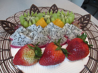 One of their colleagues brought back a cake from a Chinese bakery in Boston - the Kam Bakery. What came out of the box was a very good looking cake reminiscent of a typical American over-sweetened and heavily frosted thing. It was nicely decorated with said decorations including kiwi fruit, dragon fruit, grapes and some chocolate lacey stuff. Quite nice!